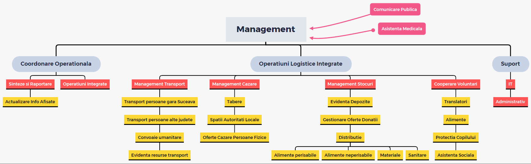 Management in Siret is divided into three major areas, which have managers for each of the positions in red in the organigram above.  The people in-charge of these roles rotate with a day shift and a night shift, and most rotate on a weekly basis on Sundays.  In order to obtain help in any of the areas listed, please come to the command center that is next to the customs point entry, in the big building on the right side.  For problems that happen within the perimeter, talk to members of IJ / IGSU / Jandarmarie or come directly to the command center, for problems that occur outside of the perimeter, contact 112.